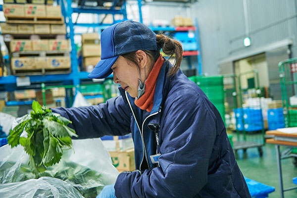 倉庫に集めた野菜を、飲食店へ届けるために注文に応じてピッキング・段ボール梱包する仕事です。集荷トラックが来るまでの限られた時間で注文に対応するため、迅速な作業とチームワークで仕事を進めます。